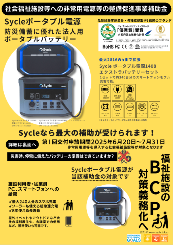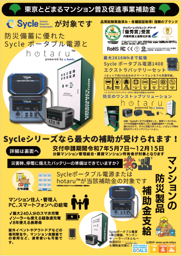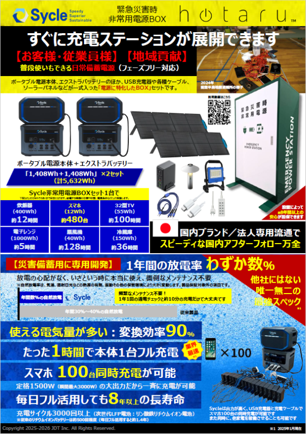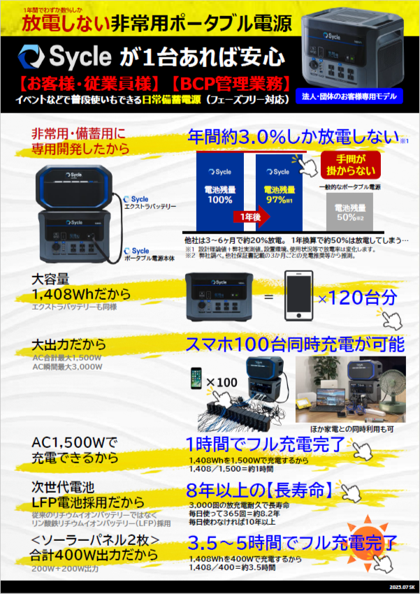 非常用ポータブル電源「Sycle」および「hotaru™」の営業ツールです。お客様へのご提案・ご説明にお使いください。