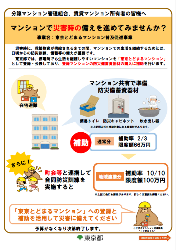 東京都が停電時でも生活を継続しやすいマンションを「東京とどまるマンション」と登録・指定しており、登録マンションの防災備蓄資器材に補助を行います。