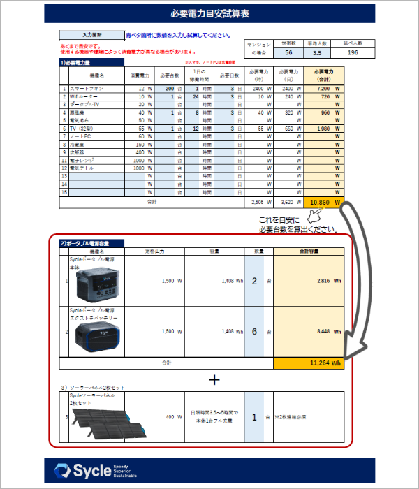 災害時に避難場所で必要となる総電力量を算出する試算表です。スマートフォン、Wi-fiルータ、ノートPC、冷蔵庫などの台数を入力することで簡単に試算できるExcelファイルです。