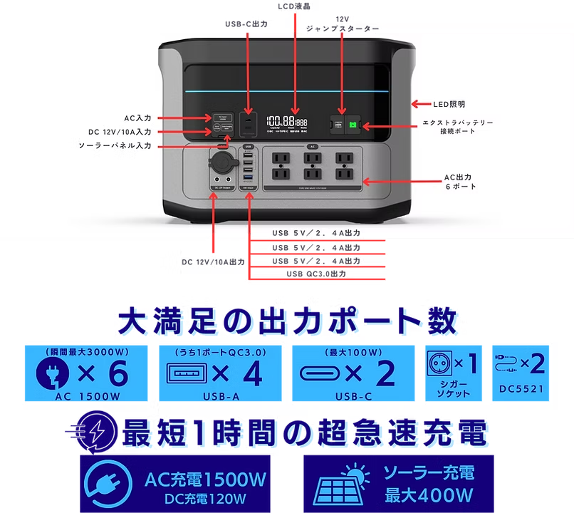 | 出力ポート | AC (x6) 合計最大1500W(瞬間最大3000W)、 100V 50/60Hz、純正弦波 USB-A (x3)5V-2.4A、 各ポート最大12W USB-A 急速充電(x1)5V-3A、9V-2A、12V-1.5A、最大18W USB-C (x2)5V-3A、9V-3A、12V-3A、15V-3A、20V-3A、20V-5A、合計最大100W DC5521 (x2)12V-10A、合計最大120W シガーソケットポート(x1)12V-10A、合計最大120W |
